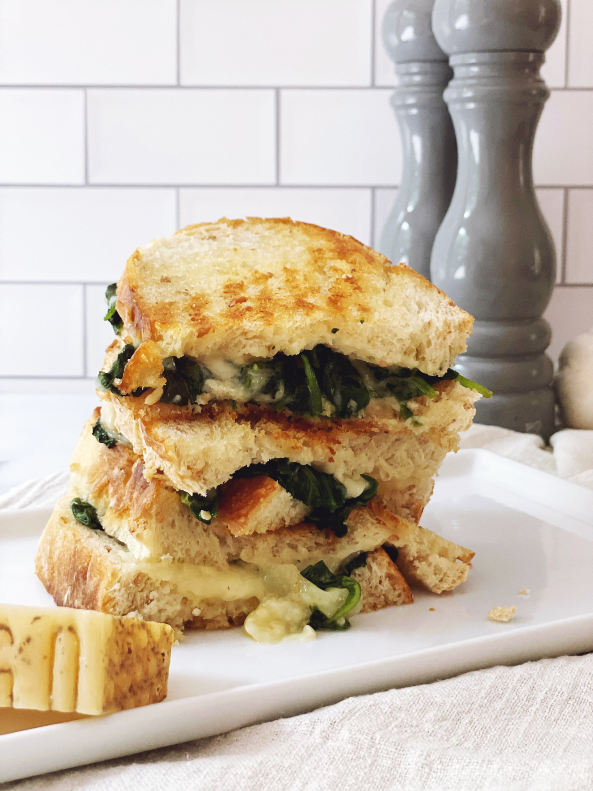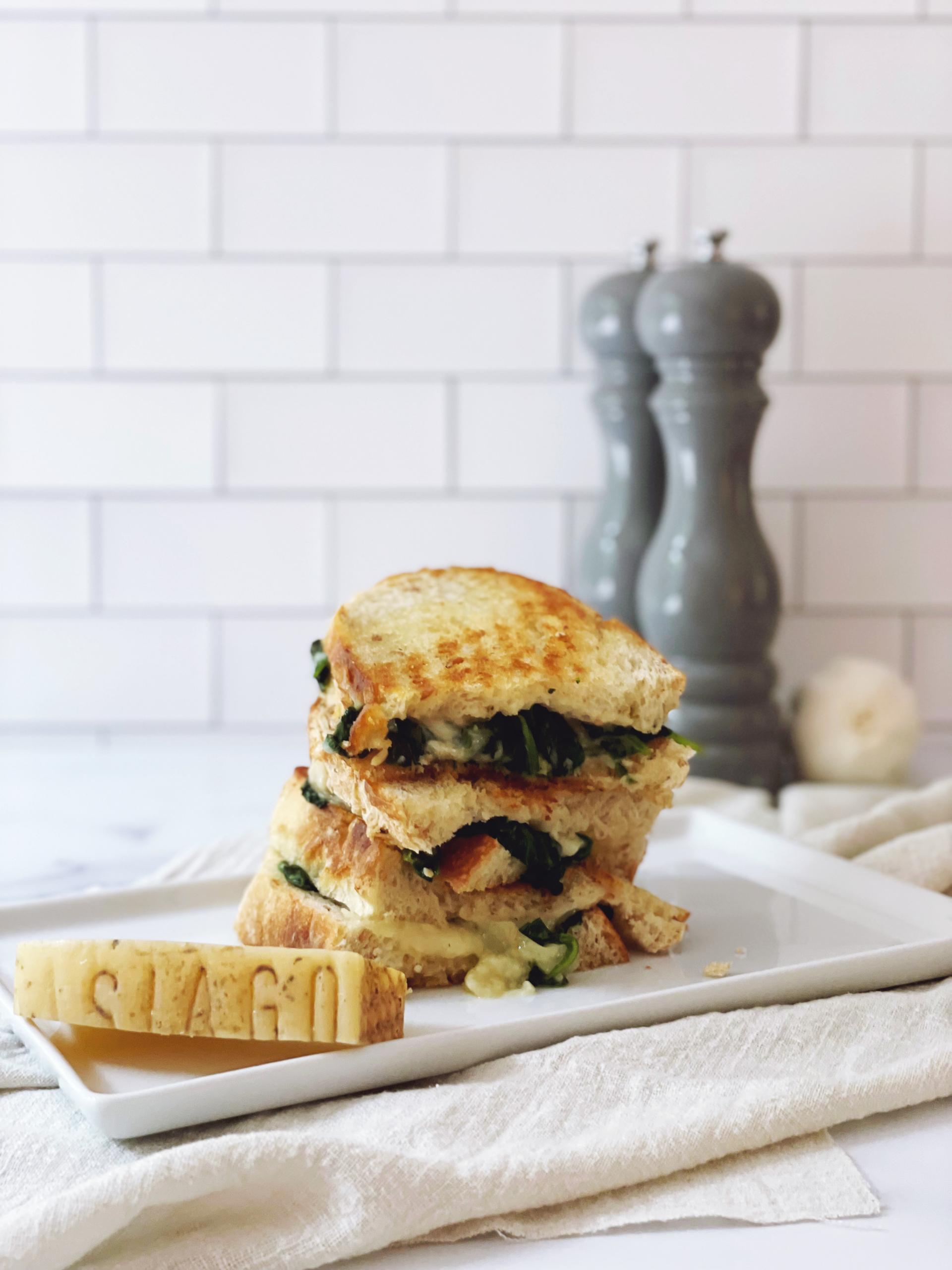Assemble sandwiches: Place slices of buttered bread (butter side down) onto grill pan or panini press. Spread spinach mixture onto bread and top with the second slice of buttered bread, butter side up. Cook for 2-3 minutes per side or until golden brown.