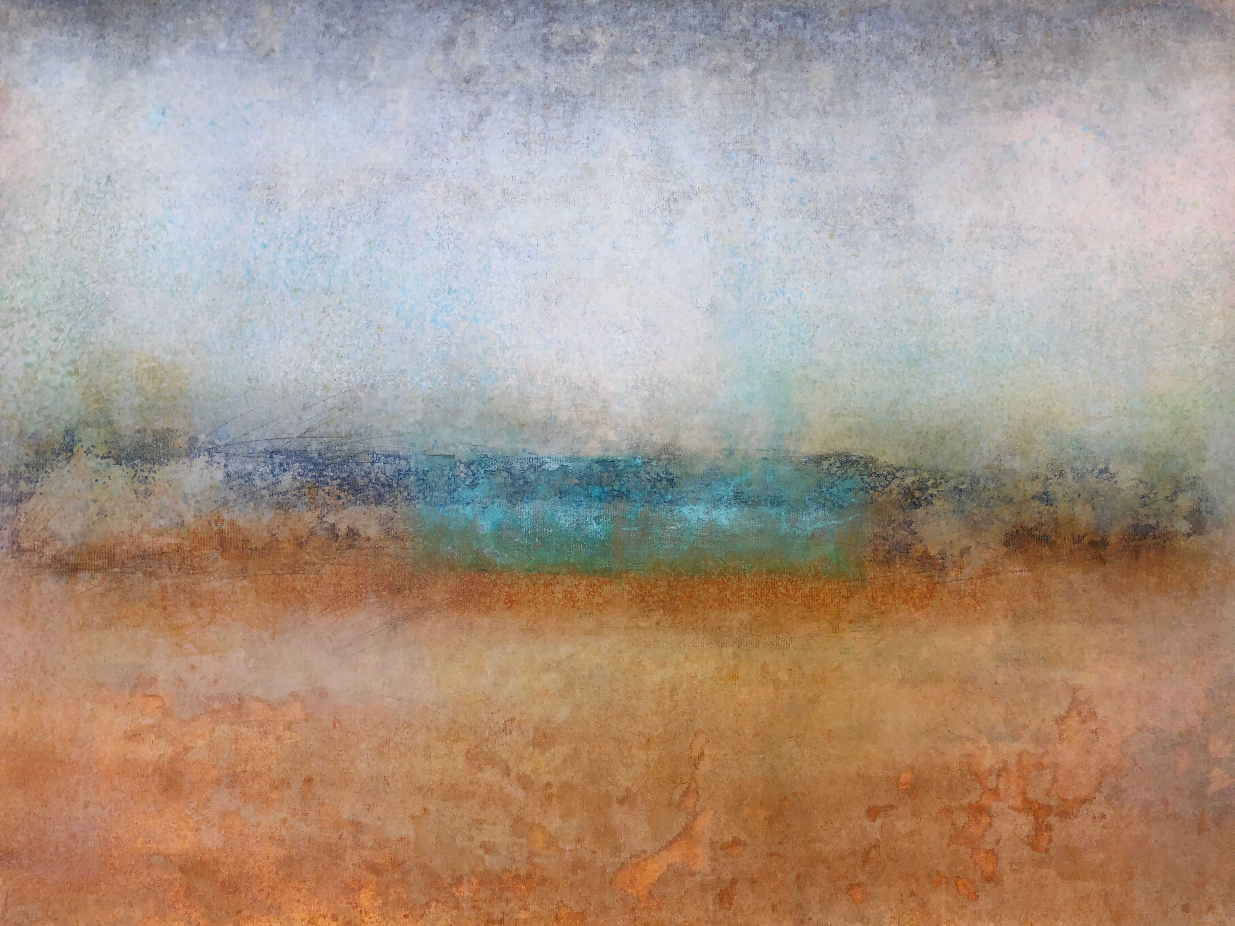 The emotional impact of change, time, weather, and light, I employ a wide range of techniques. I lay down rich fields of color, enhanced by many layers of transparent glazes. To intensify the effects of depth and mystery, I may use a foundation of metal leaf or applied textures. After building up a surface I then scar it or even scrape it away only to cover it over again with a new layer. I like “closing away” lower layers, except for scattered spots of color–a reminder that more is happening in a painting than what is perceived on the surface. I hope this process creates for the viewer a calm moment in which to reflect on what, in a larger sense, has been hidden from view. – Scott Upton 2019