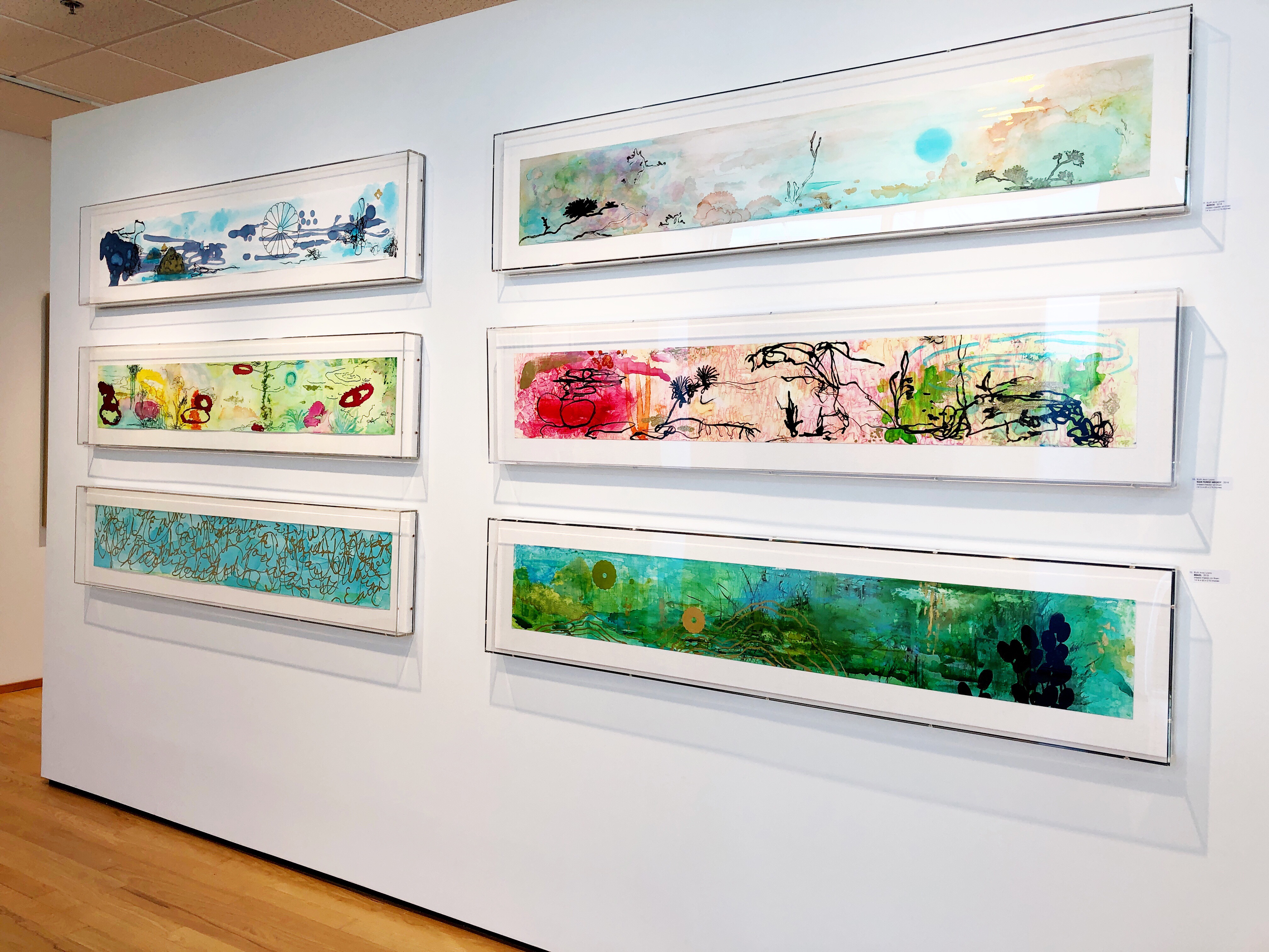 Her latest exhibition, Odyssey features brilliantly colored works including her Verses Series which features mixed media on aluminum. The exhibition also includes works with oil & gold leaf on canvas and mixed media on linen in custom-made acrylic boxes.