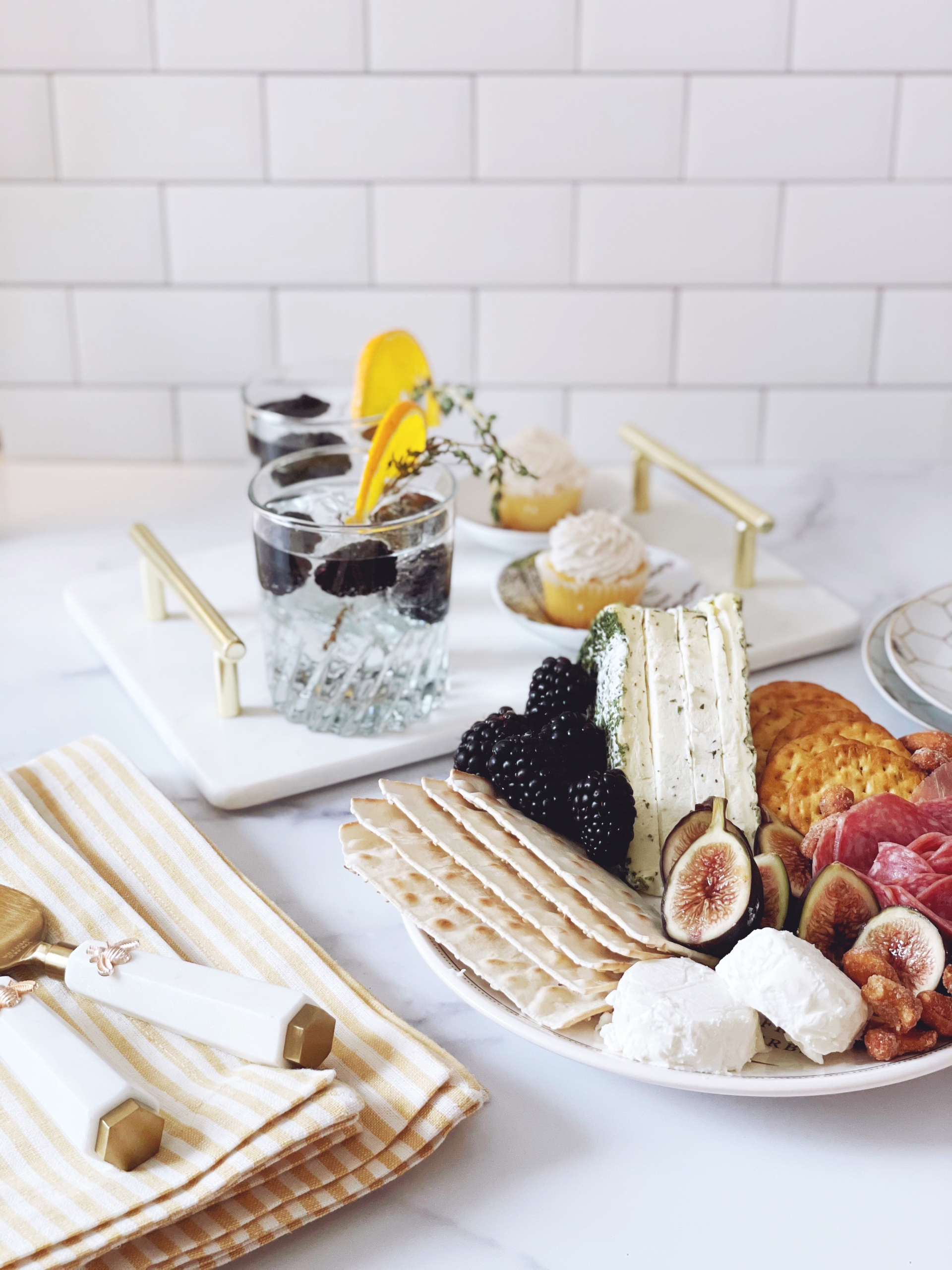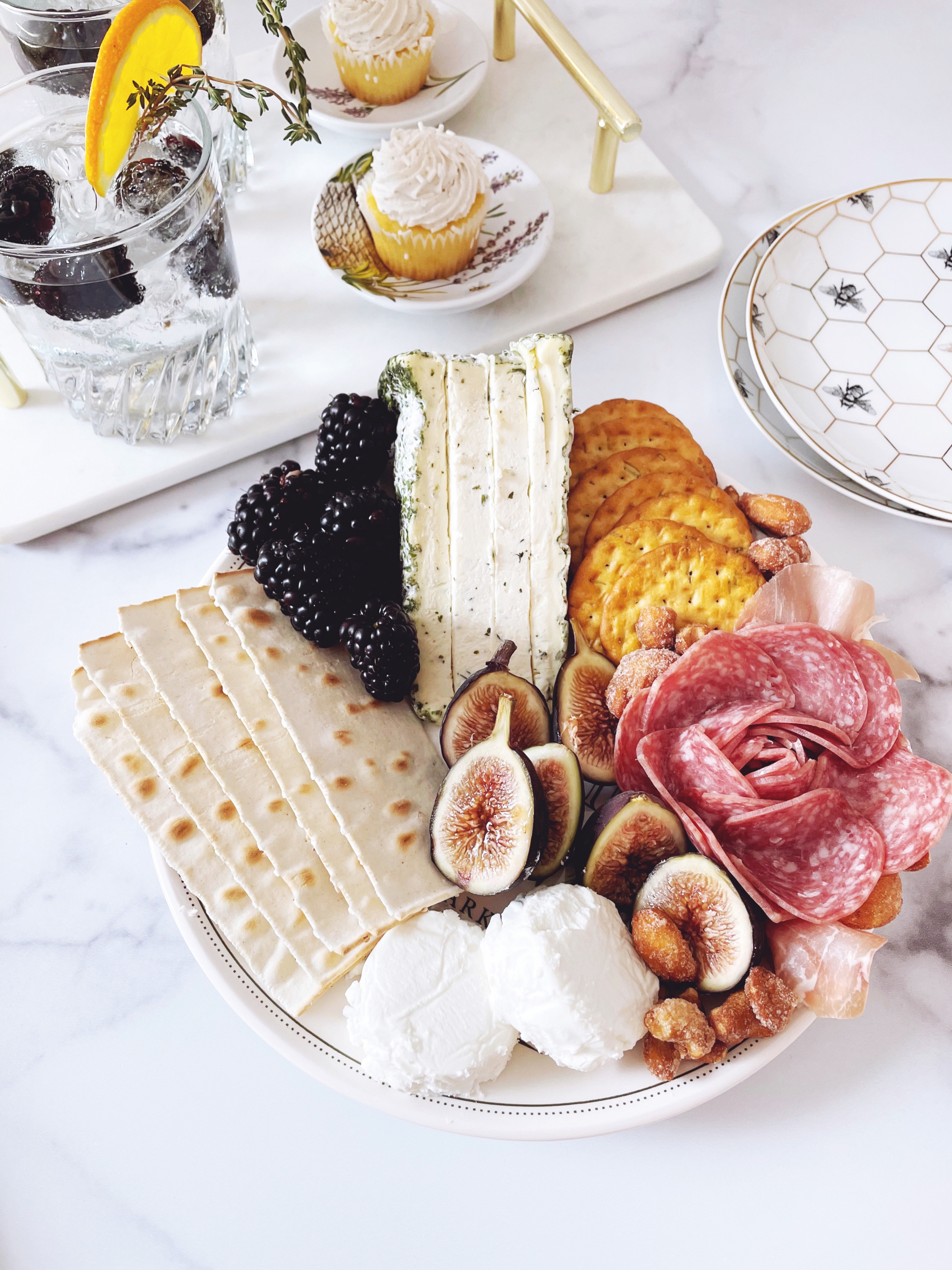 When creating a charcuterie board, you don’t always have to have a marble, wood platter to create your board. When we created a charcuterie for two (coming to the blog next week) we used a long plate we ordered from CB2 and for our spa day we used this Provence plate that I picked up from Sur la Table several years back. For serving our cheese we have our favorite cheese set from Williams-Sonoma and cloth napkins from Pottery Barn.